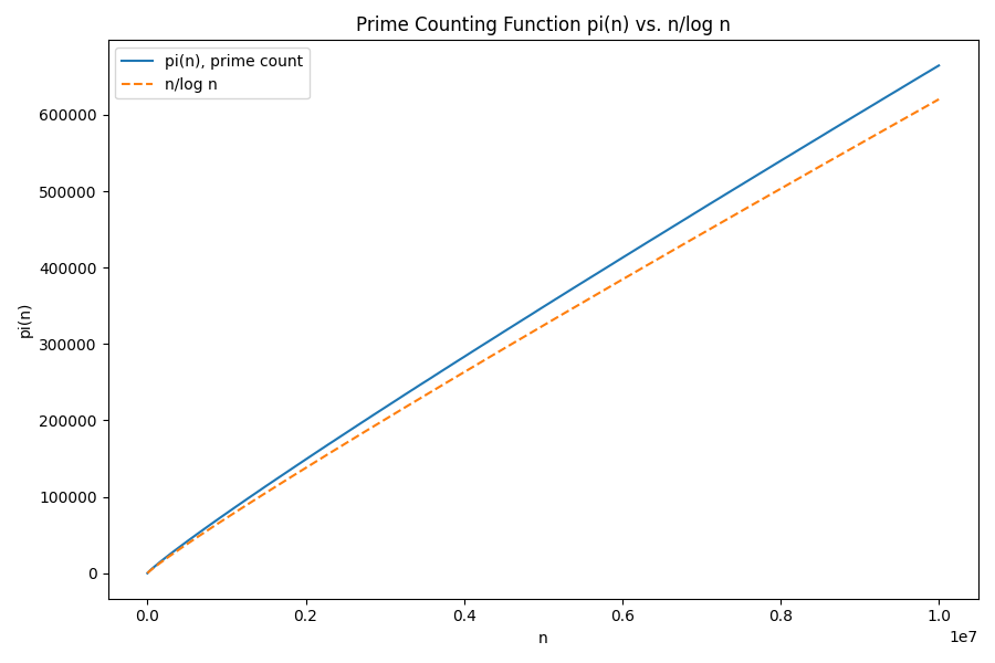 After we run our code with this updated version of plot_primes(), we see that n/log(n) is not a perfect approximation of π(n), but it tracks π(n) remarkably well.