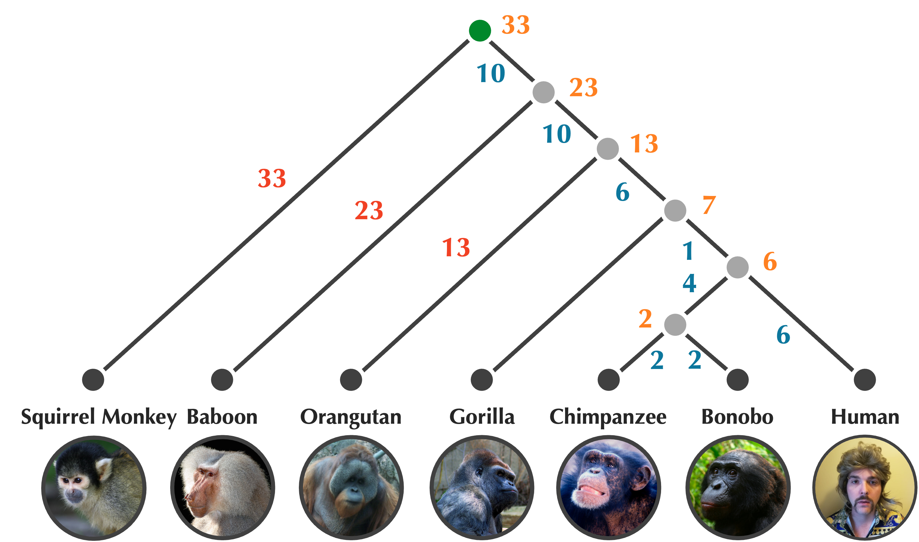 The rooted tree of primates in the figure below has the additional property of being ultrametric, which means that each node is labeled by a number called an age indicating its distance from the leaves. In the tree above, this number represents the age of the ancestor in millions of years; leaf nodes are all present-day species and receive an age of zero. UPGMA will produce an ultrametric tree.