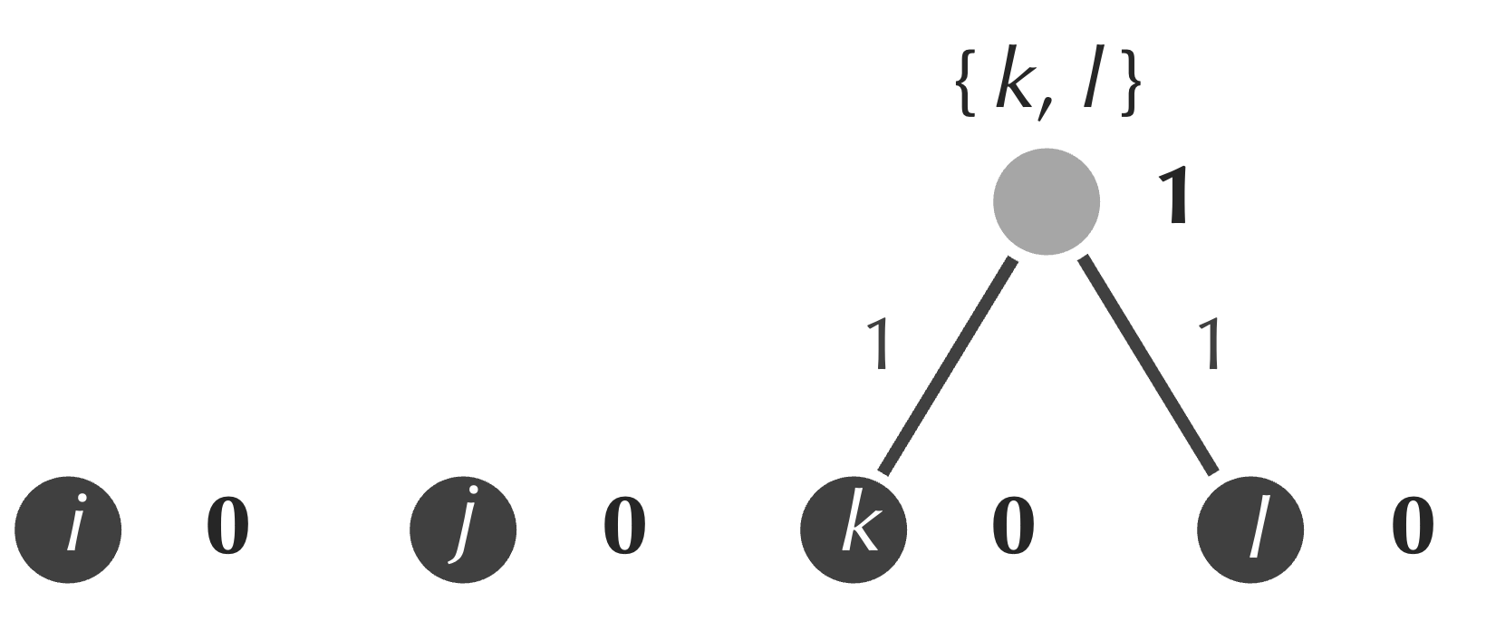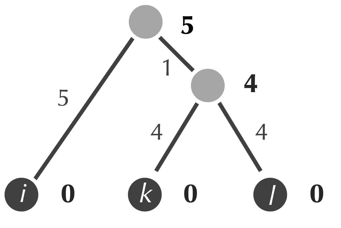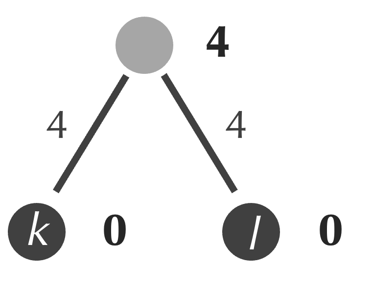 Next, although we saw in the previous lesson that this idea can sometimes lead us astray, we identify the minimum element of the matrix, which is equal to 2 and represents the distance between k and l. We form a new internal node connecting to both k and l, and we assign the age of this node equal to half of the matrix’s minimum value, or 1 (figure below). As a result, the edges connecting each of k and l to our new node receive weights equal to 1, which ensures that the path connecting k and l has length equal to 2.