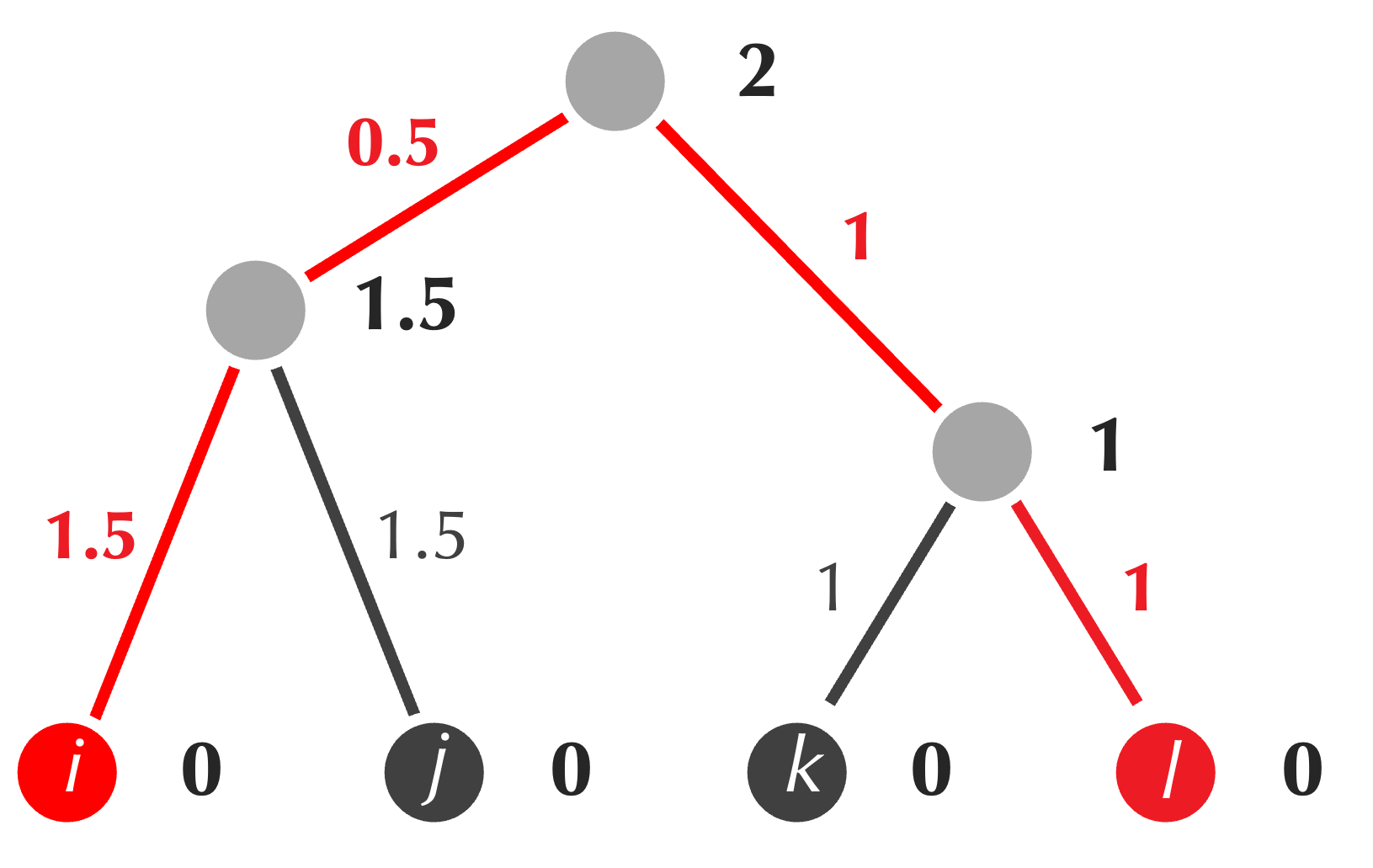 The tree produced by UPGMA is also reproduced below, with the path from i to l highlighted in red. This path has total length 4, but its corresponding distance matrix value D[i, l] is equal to 3. In general, the averaging performed by UPGMA means that for some pairs, the length of the path connecting them in the tree will be greater than the corresponding distance matrix value, and sometimes, this length will be lower than the corresponding distance matrix value.