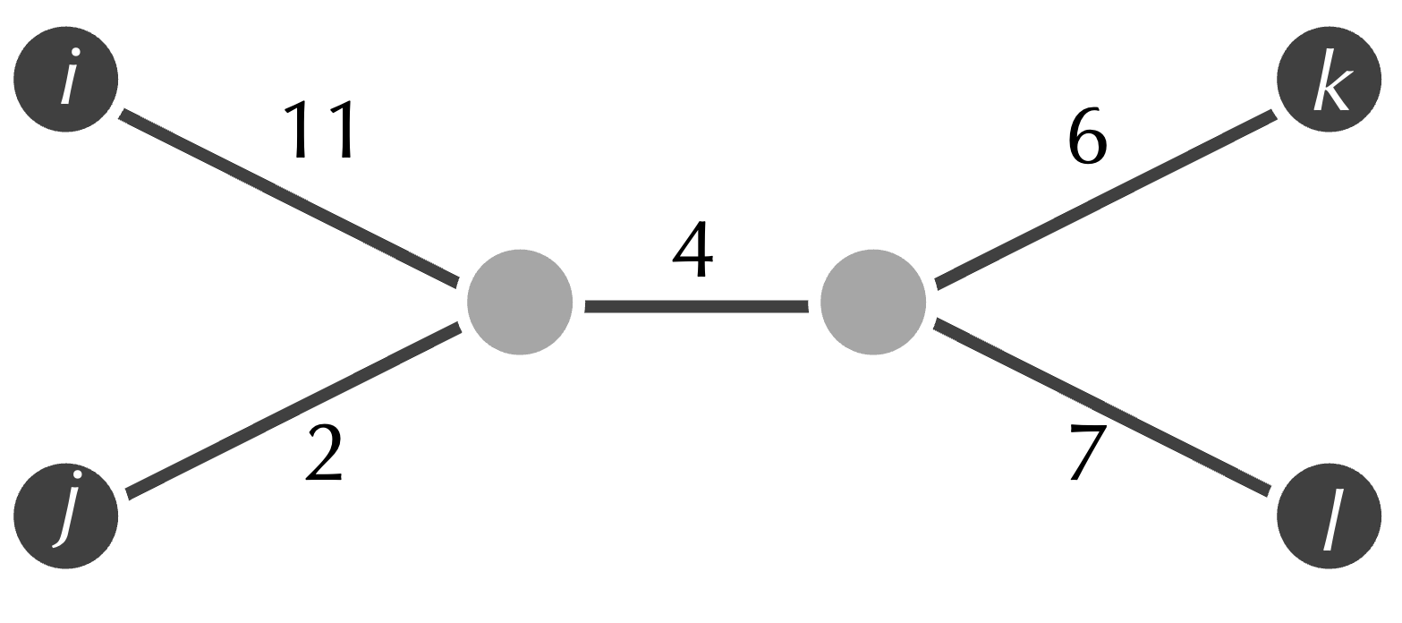 One might imagine that j and k should be neighbors in the tree fitting this matrix. Yet the tree that fits this matrix is shown in the figure below, in which j and k are connected by a path with three edges. As a result, inferring neighbors from the matrix’s smallest element provides a flawed starting point for our algorithm.