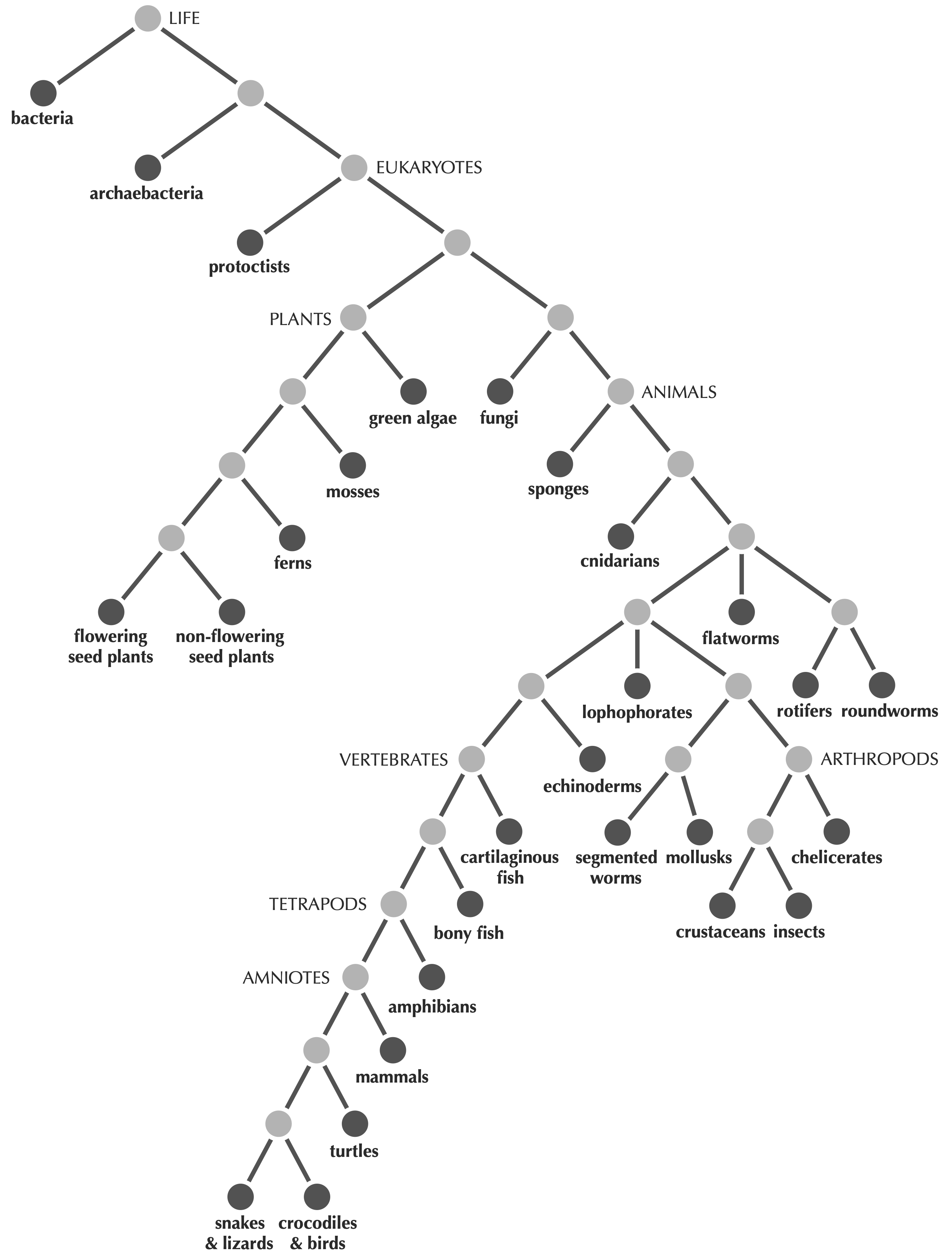 We begin with resolving the issue of what precisely we mean by a tree. Defining a tree precisely might not seem important, since we know that we want to build a tree of life like the one shown in the introduction or in the figure below.