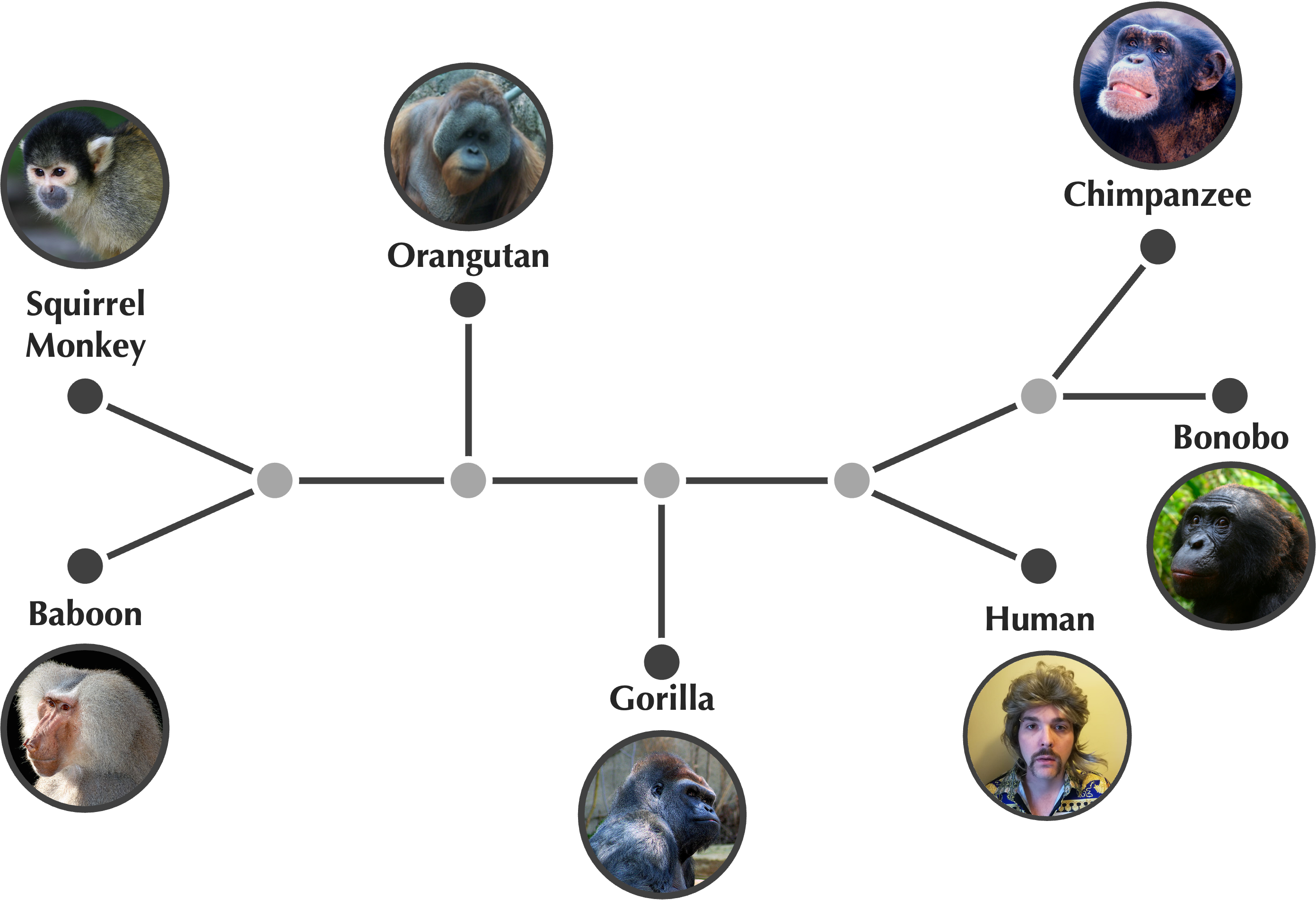 The node at the top of the tree above is called the tree’s root, since we infer it as the most recent common ancestor of all organisms represented in the tree. Often, inferring the root is a separate task to producing the tree. For example, consider the unrooted tree shown in the figure below. Students often assume that the most recent common ancestor of these beautiful organisms must exist somewhere in the middle of the tree, but the true root exists on the distant edge connecting the squirrel monkey to its most recent ancestor.